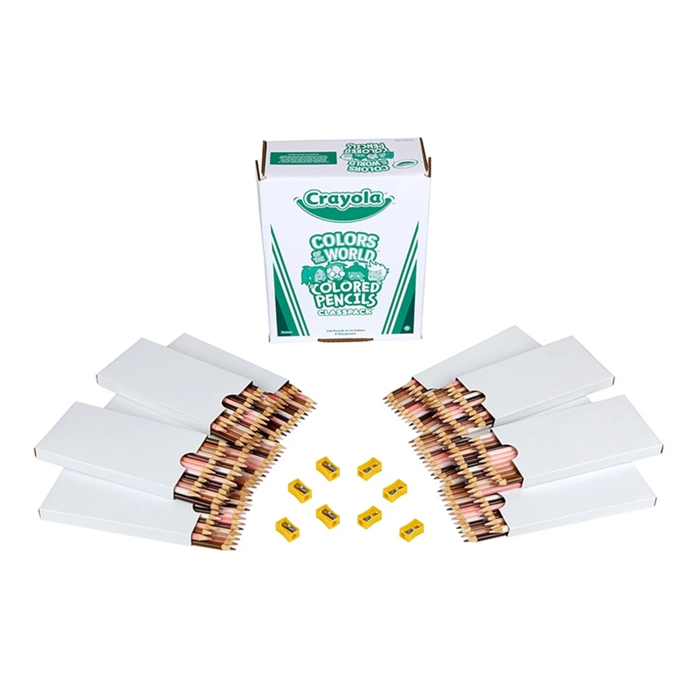 This Crayola Colors of the World Bulk Colored Pencil Set contains 240 colored pencils in 10 sets of 24 specially formulated colors and 8 pencil sharpeners. These skin tone colored pencils are a welcome addition to any classroom art tools collection, allowing children to make school projects more realistic and true to their world. The subtle shades inside are formulated to better represent the growing diversity around the globe. Colors of the World fall into three main shades: Almond, Golden and Rose – and all the darker or lighter shades in between. This pack includes 24 colored pencil colors that represent people of many different regions and cultures. Makes a great addition to classrooms, art rooms, and more!