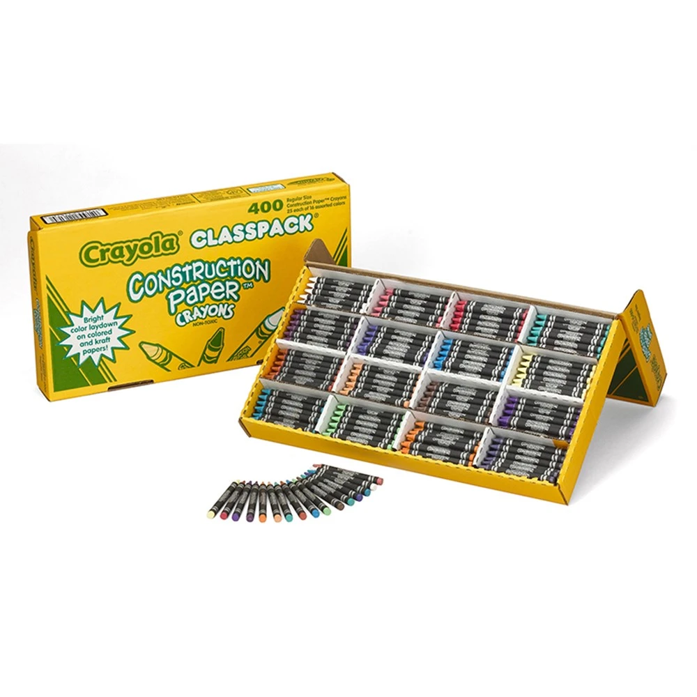 Construction Paper Crayons allows the flexibility to color on a variety of paper types including craft paper, paper bags, cardboard, light-colored and dark-colored construction paper. Opaque, bright-colored crayons provide complete, brilliant coverage for outstanding project results. Crayons provide true color, no piling, no buildup, or no erasing of crayon layers. Point and barrel are strong, durable, and long-lasting. Crayons are double-wrapped for added strength with the color name on the label and packed in a sturdy, compartmentalized, convenient, reusable Classpack. Each box contains 25 each of 16 colors: pink, red, red-orange, orange, yellow-orange, yellow, yellow-green, green, blue-green, blue, blue violet, violet, red-violet, brown, black and white. Crayons are certified AP nontoxic and conform to ASTM D-4236.