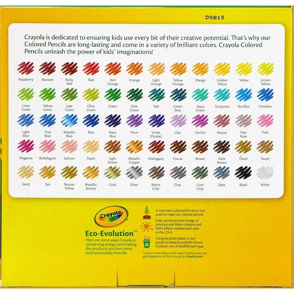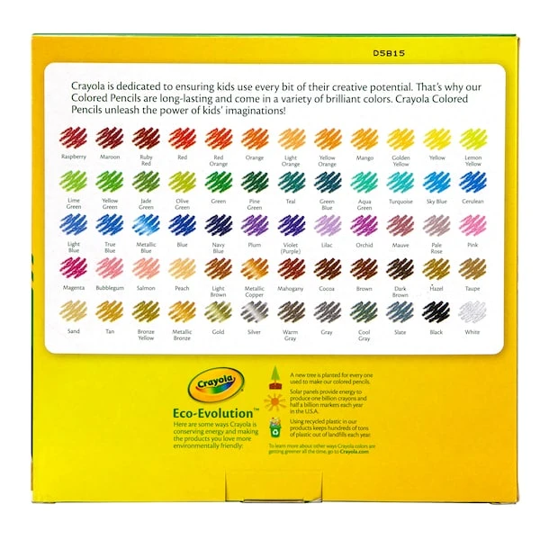 Crayola Colored Pencils unleash the power of kids’ imaginations! These Pencils have intense colors with smooth lay down and are pre-sharpened. The long pencils are strong and durable. 100 different colors. Made from reforested wood, which is unique to Crayola, and never from tropical rainforest or endangered species. AP Certified nontoxic.