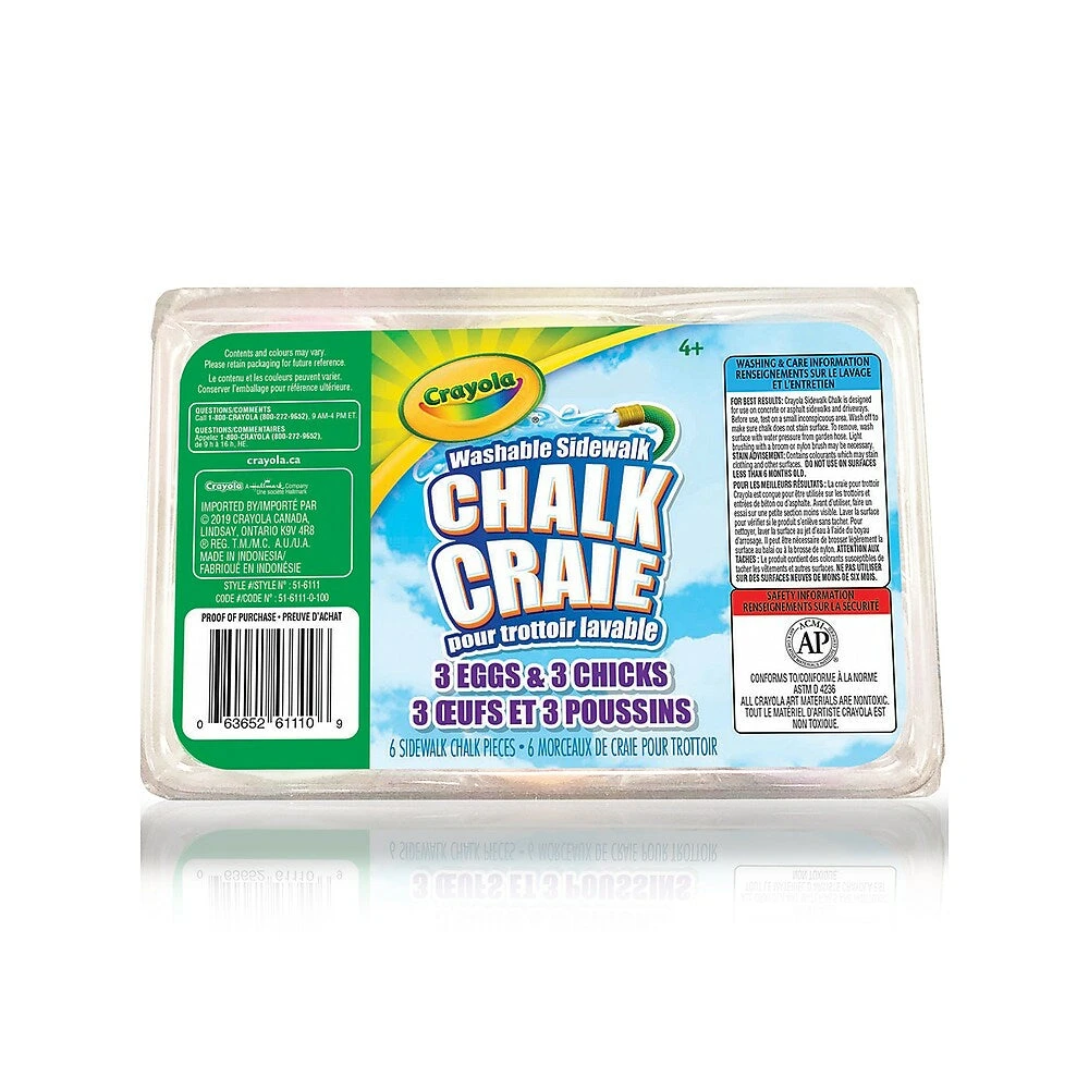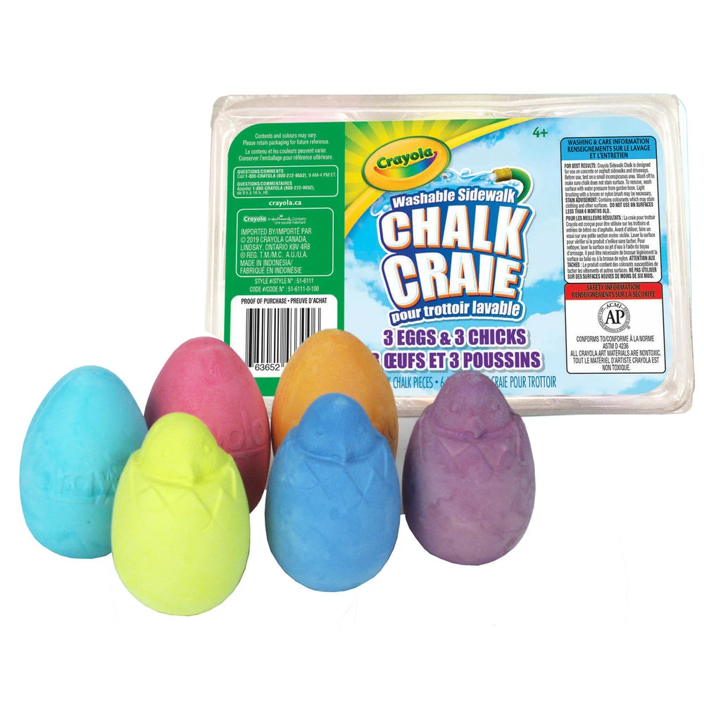 Spring into outdoor fun with Crayola Washable Sidewalk Chick & Egg Chalk. Includes: 3 egg shaped and 3 chick shaped sidewalk chalk shapes in 6 different colours.
