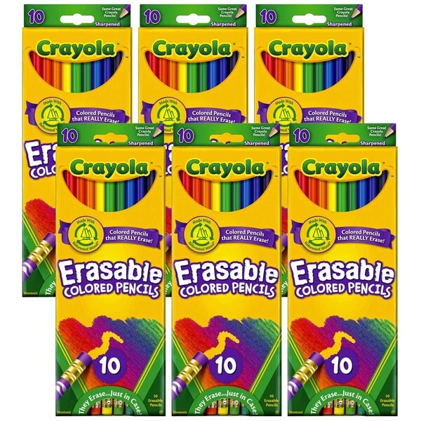 Crayola Erasable Colored Pencils make it easy to change drawings and fix mistakes. Now kids can complete picture-perfect homework assignments, maps, and reports in color—without having to start over. Erasable colored pencils are an indispensable tool at home and in the classroom. They are ideal for creating maps, completing art or science projects, and making signs and labels—and changing them. Crayola Erasable Colored Pencils are made with thick, soft lead, so they won’t break easily under pressure. Kids will love to use these durable, vividly colored pencils. Small enough to fit in a book bag, this portable box holds a variety of colors. The smooth colors are perfect for color mixing and blending as well as for practicing more detailed techniques. Crayola Erasable Colored Pencils are created from reforested wood instead of wood from old-growth forests. For every tree used in the manufacturing of Crayola Colored Pencils, a new tree is planted. Each box includes 10 Crayola Erasable Colored Pencils. Sold as 6 boxes for a total of 60 pencils.