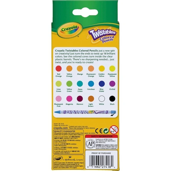 Twistables Colored Pencils put a new spin on creativity. Simply turn the ends to twist up 18 brilliant colors. See the colored cores turn inside the clear plastic barrels. They need no sharpening. When the tips get worn down, just twist them up and you’re ready to keep on coloring. The clear plastic barrels keep them from breaking and make it easy to see how much vibrant color is left. Clear barrel also allows easy color identification. Nontoxic color pencils are recommended for children ages 3 and up.
