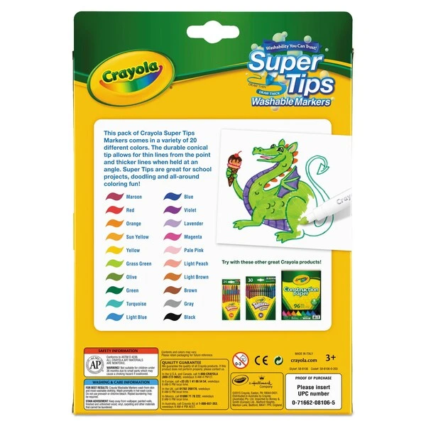Crayola® Washable Super Tips Markers, Broad/Fine Bullet Tip, Assorted Colors, 20/Set