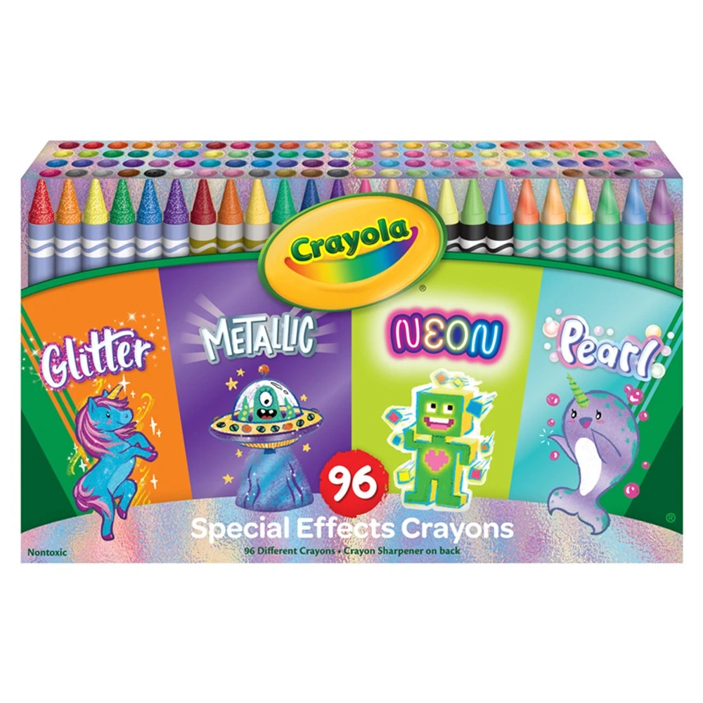 This big set of Crayola Specialty Crayons features 24 each of Neon, Metallic, Pearlescent, and Glitter Crayons—96 crayons in all! Perfect coloring supplies for coloring books, arts and crafts or other creative fun! Like all Crayola Crayons, they are double wrapped for extra strength. Specialty Crayons make a great gift! Ideal for kids ages 4 and up.